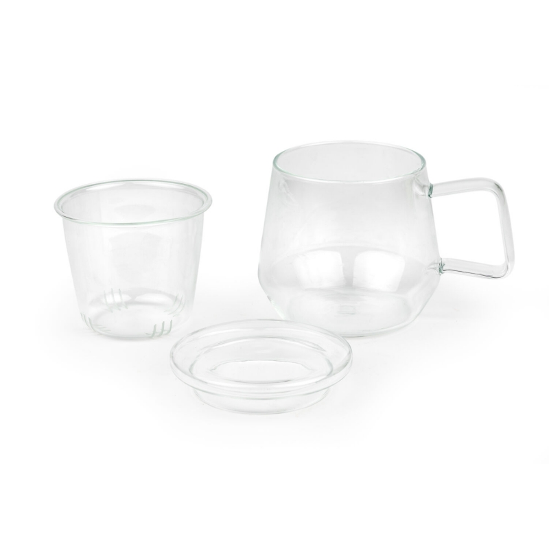 Elegant glass tea-for-one set with large filter for loose tea. Made from heat-resistant borosilicate glass and holds 290 ml.