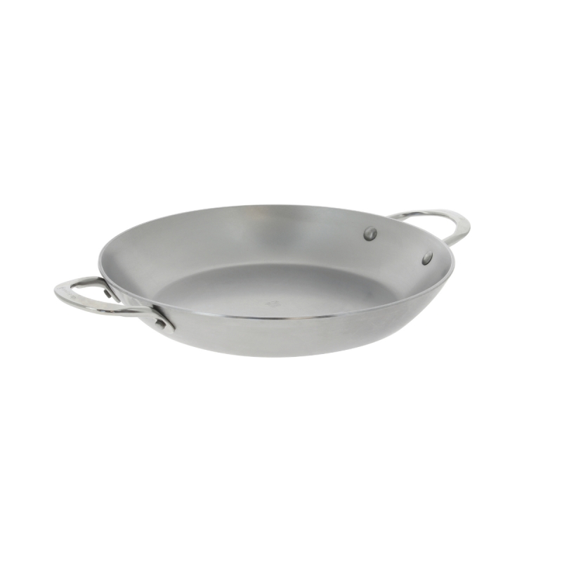 Heavy-duty Mineral B steel pan with 2 handles, ideal for paella, oven use, and serving.