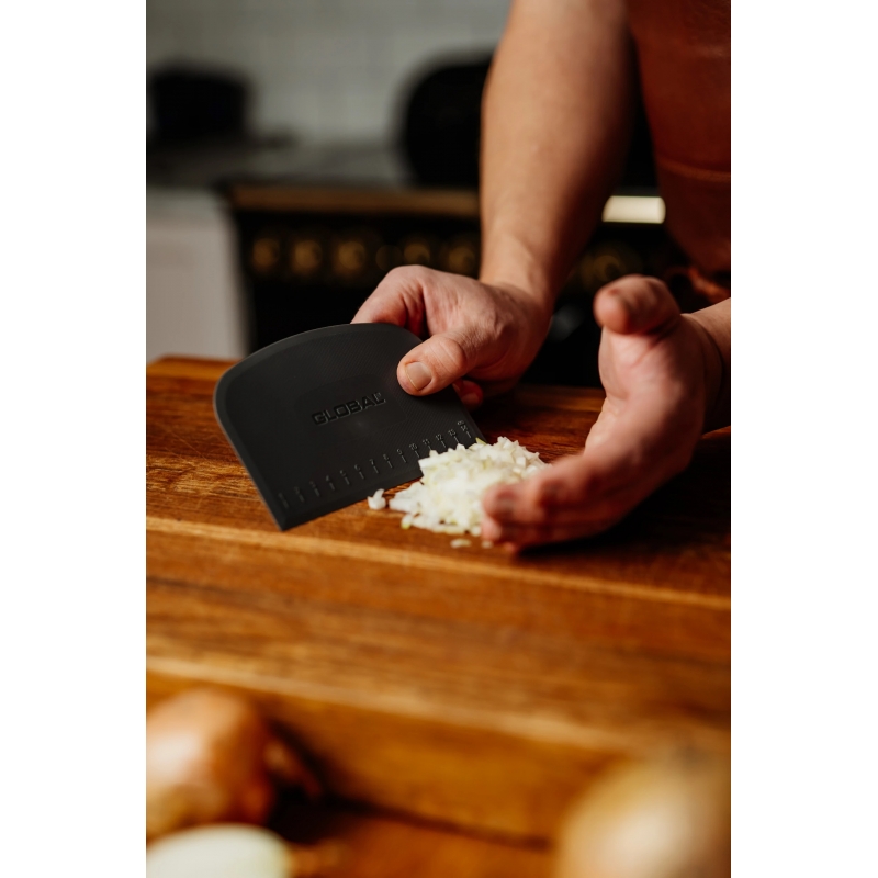 The Global Bench Scraper is a practical kitchen tool designed to make everyday food preparation cleaner and more efficient. Made from flexible plastic, it allows you to easily scrape food scraps from cutting boards and kitchen counters without damaging surfaces.
