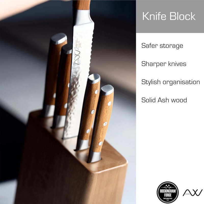Handwash knives in warm soapy water and dry immediately. Clean the ash wood block with a damp cloth. Avoid soaking or placing in the dishwasher.