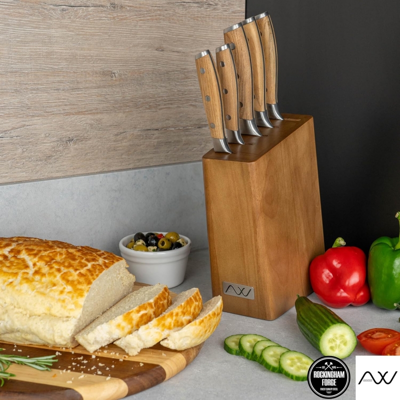 he Grunwerg RF Ashwood 6 Piece Knife Block Set is a stunning combination of practicality and design. Crafted with precision, it includes five essential knives and a beautifully curved ash wood block that adds natural warmth and style to your kitchen.