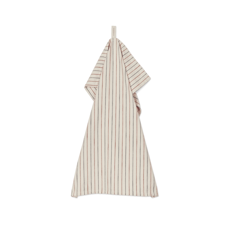 A recycled cotton blend tea towel with a textured slub weave and striped design in seasonal colours.