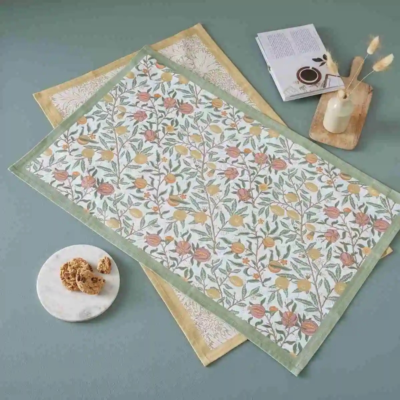Kahe puuvillase köögirätiku komplekt ikooniliste Morris & Co. Fruit ja Marigold mustritega. Stiilne, imav ja ideaalne igapäevaseks kasutamiseks.