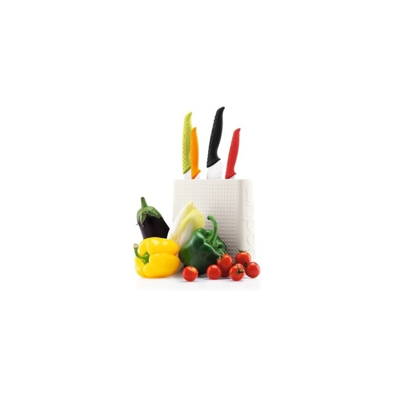 Bodum Bistro -veitsitukki pitää veitset turvallisesti, kätevästi ja järjestyksessä. Joustavat muovivartaat pitävät veitset tukevasti missä tahansa asennossa.