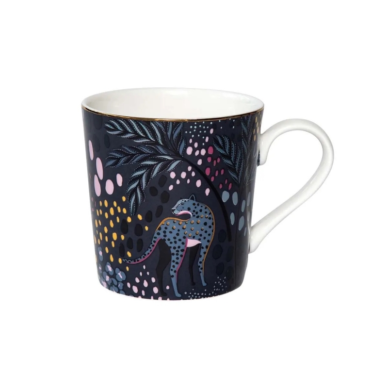 Portmeirion Fine China Mug – Sara Miller Midnight Leopard tuo eksotiikkaa ja hienostunutta glamouria tee- ja kahvihetkiin. Hienosta posliinista valmistettu muki esittelee elegantin leopardin liukumassa rehevien, värikkäiden lehtien keskellä syvän midnight-sinisen taustan edessä.