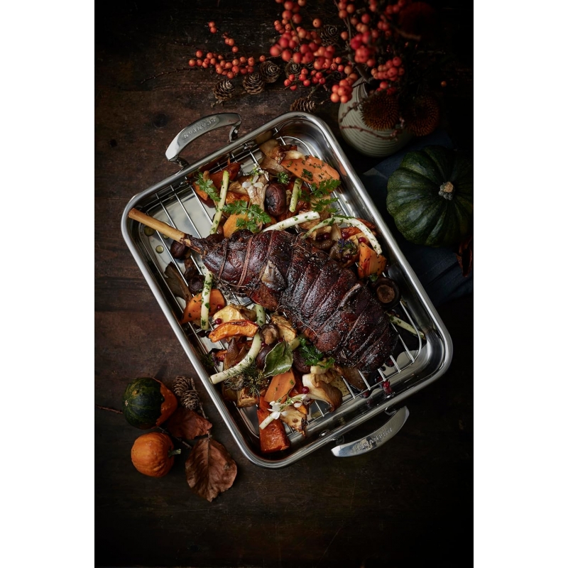 Scanpan Impact uunivuoka ritilällä on monikäyttöinen keittiön luottotyökalu, joka soveltuu niin uuniin kuin kaikille liesitasoille. Mukana tuleva ritilä takaa täydellisen ilmankierron ja tasaisen paistotuloksen meheville paisteille.