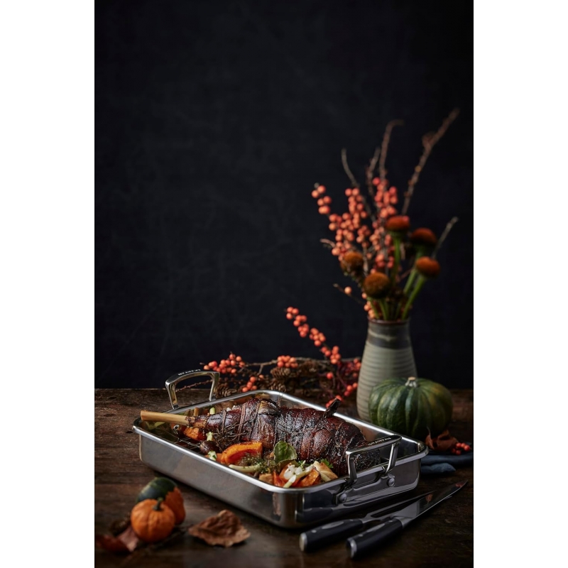 Tämä Scanpan Impact -sarjan uunivuoka on suunniteltu palvelemaan kaikissa keittiön tarpeissa. Valmistat siinä vaivatta niin lasagnet, laatikkoruoat, paahdetut juurekset kuin uunilohenkin. Erityisen käytännölliseksi vuuan tekee sen yhteensopivuus kaikille lämmönlähteille – voit siis aloittaa paistamisen liedellä ja siirtää vuuan suoraan uuniin. Ritilän avulla kuuma ilma pääsee kiertämään myös lihan alta, mikä varmistaa rapean pinnan ja tasaisen kypsyyden.