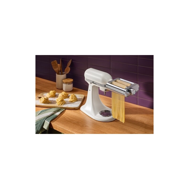 Naudojamas su „KitchenAid“ pastatomu plakikliu* , makaronų priedas „trys viename“ padės lengvai iškočioti ir supjaustyti šviežius makaronus.
