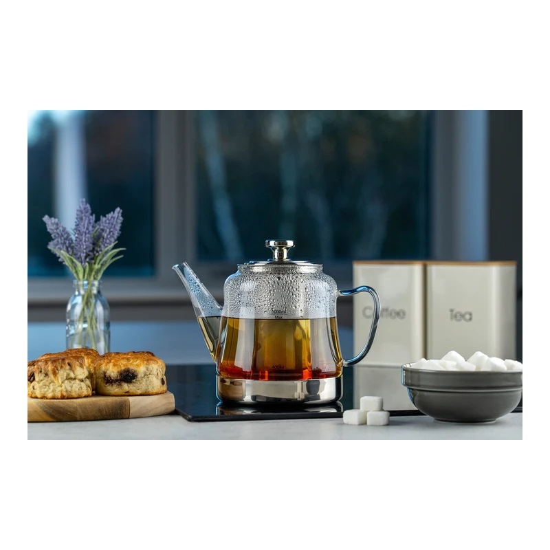 Indukcijai tinkamas nerūdijančio plieno dugnas užtikrina tolygų šilumos paskirstymą, o karščiui atsparus stiklas leidžia stebėti plikymo procesą ir pasiekti norimą arbatos stiprumą.