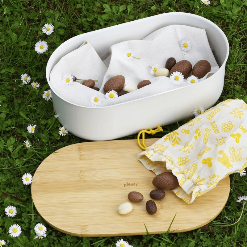 „Pebbly“ duoninė yra stilingas pasirinkimas šiuolaikinei virtuvei, padedantis išlaikyti kepinius šviežius. Kreminės spalvos metalinis korpusas saugo duoną nuo drėgmės pertekliaus, o apverčiamas bambukinis dangtis tarnauja kaip patogi pjaustymo lenta. Pridedamas ekologiškos medvilnės maišelis leidžia patogiai parsinešti duoną iš kepyklos nenaudojant vienkartinių pakuočių. Elegantiškas ir natūralus dizainas puikiai atrodo tiek ant virtuvės stalviršio, tiek serviruojant maistą ant stalo.