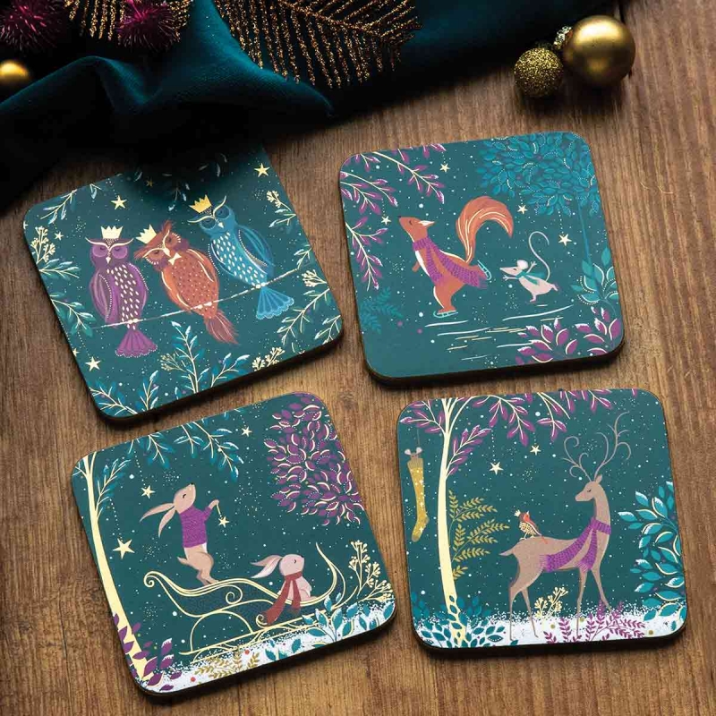 Sara Miller Woodland Tales padėkliukai stikliams, 4 vnt., žiemiški miško motyvai, ryškios spalvos. Lakinis paviršius ir kamštinė apačia apsaugo stalą.