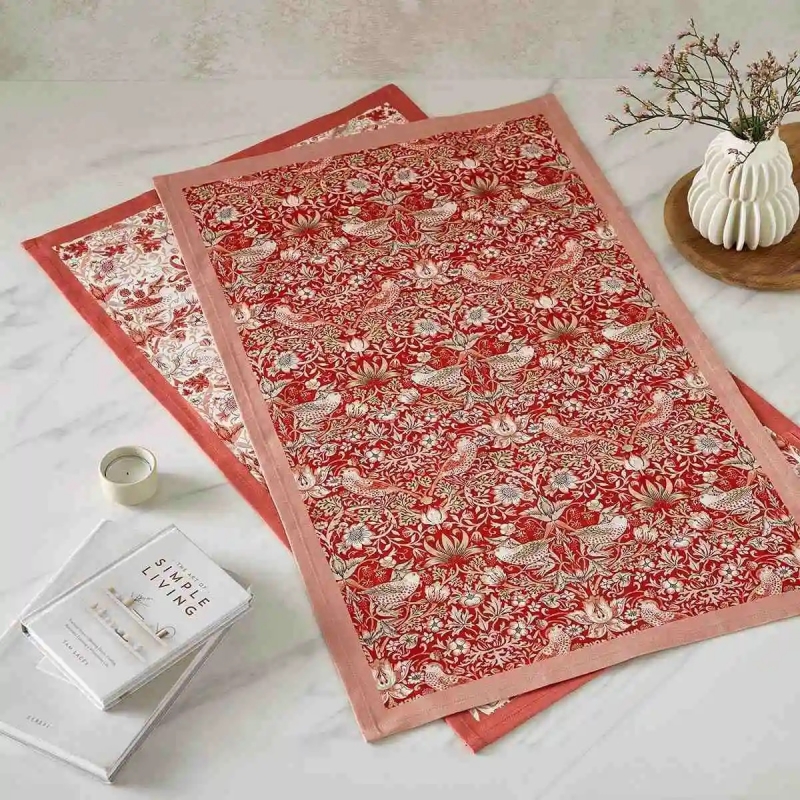 Spode Pimpernel Morris & Co. Strawberry Thief virtuvinių rankšluosčių rinkinys suteikia virtuvei išraiškingo dizaino ir britiškos klasikos. William Morris Strawberry Thief raštas pasižymi detalia paukščių ir augalų ornamentika, kuri atrodo laikui nepavaldi ir dekoratyvi.