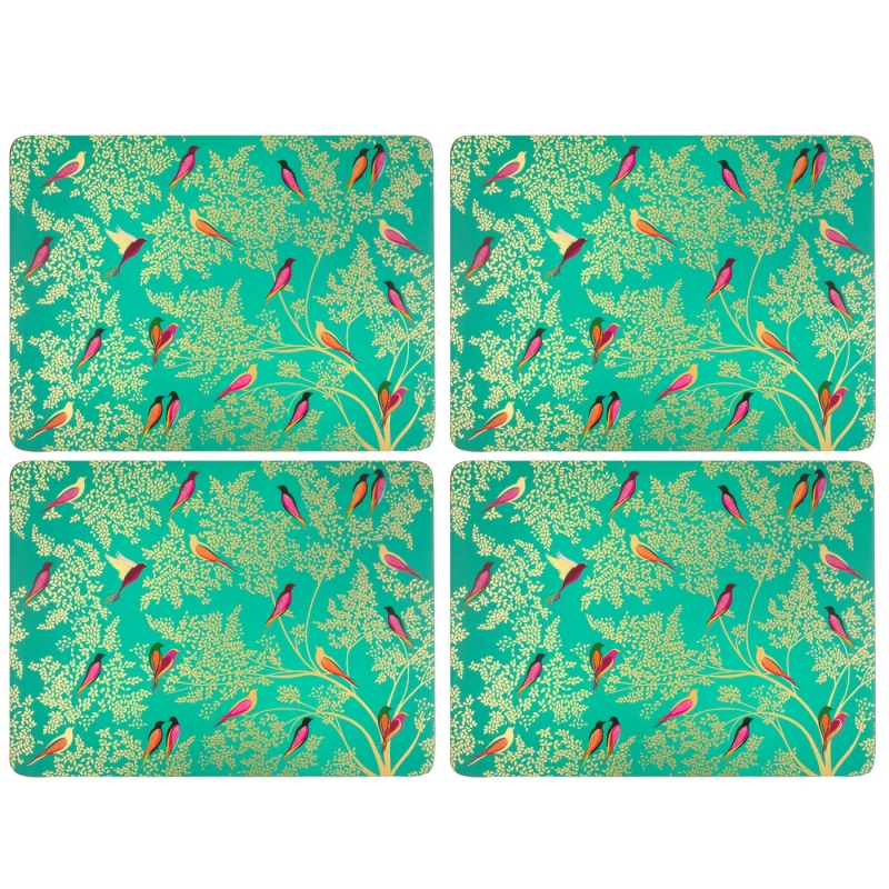 Četri lieli, zaļi, augstas kvalitātes galda paliktņi ar gumijas pamatni, kas aizsargā virsmas no karstuma, skrāpējumiem un traipiem.