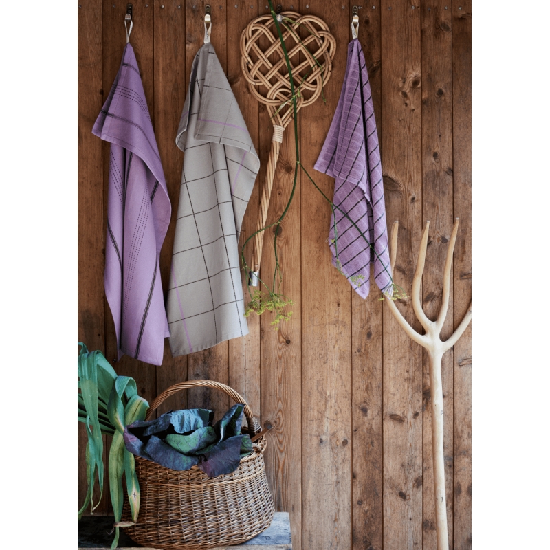 GOTS sertificēts organiskās kokvilnas virtuves dvielis smilšu tonī ar zaļām un lavandas krāsas rūtainām detaļām.