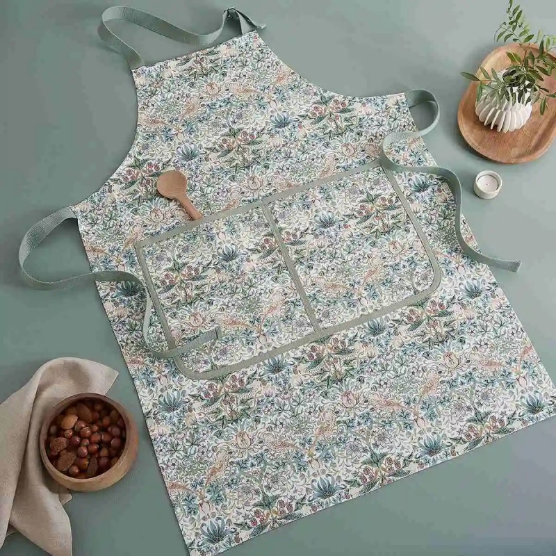 100% kokvilnas priekšauts ar ikonisko Strawberry Thief rakstu maigi zaļos un rozā toņos. Stilīga aizsardzība ēdiena gatavošanā, cepšanā vai dārza darbos.