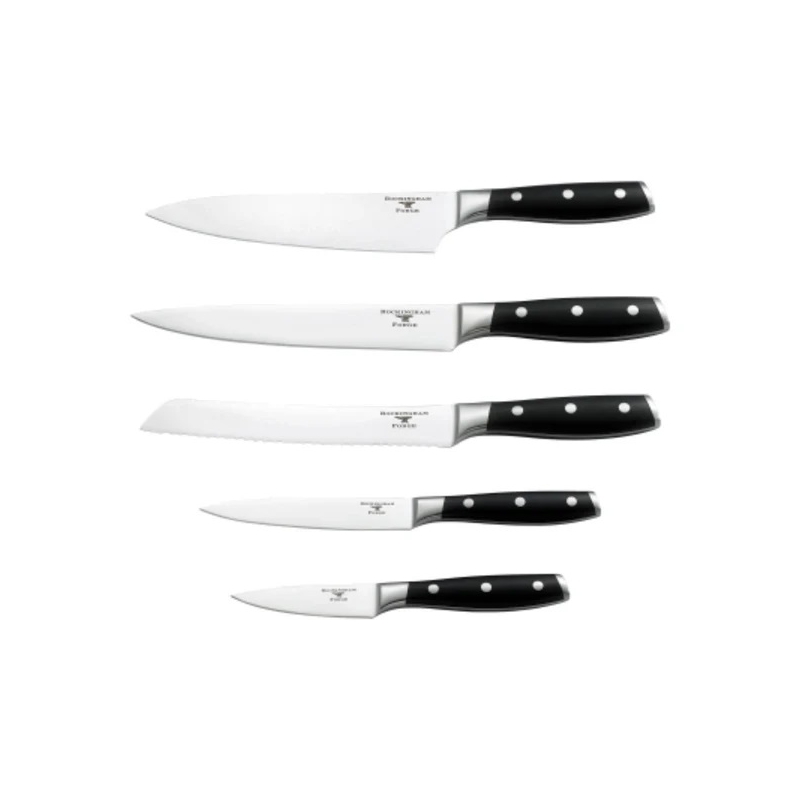 Создан для кулинаров, которые ценят функциональность и стиль, этот набор включает пять острых ножей из нержавеющей стали, размещённых в прочной деревянной подставке с современным, но классическим внешним видом.